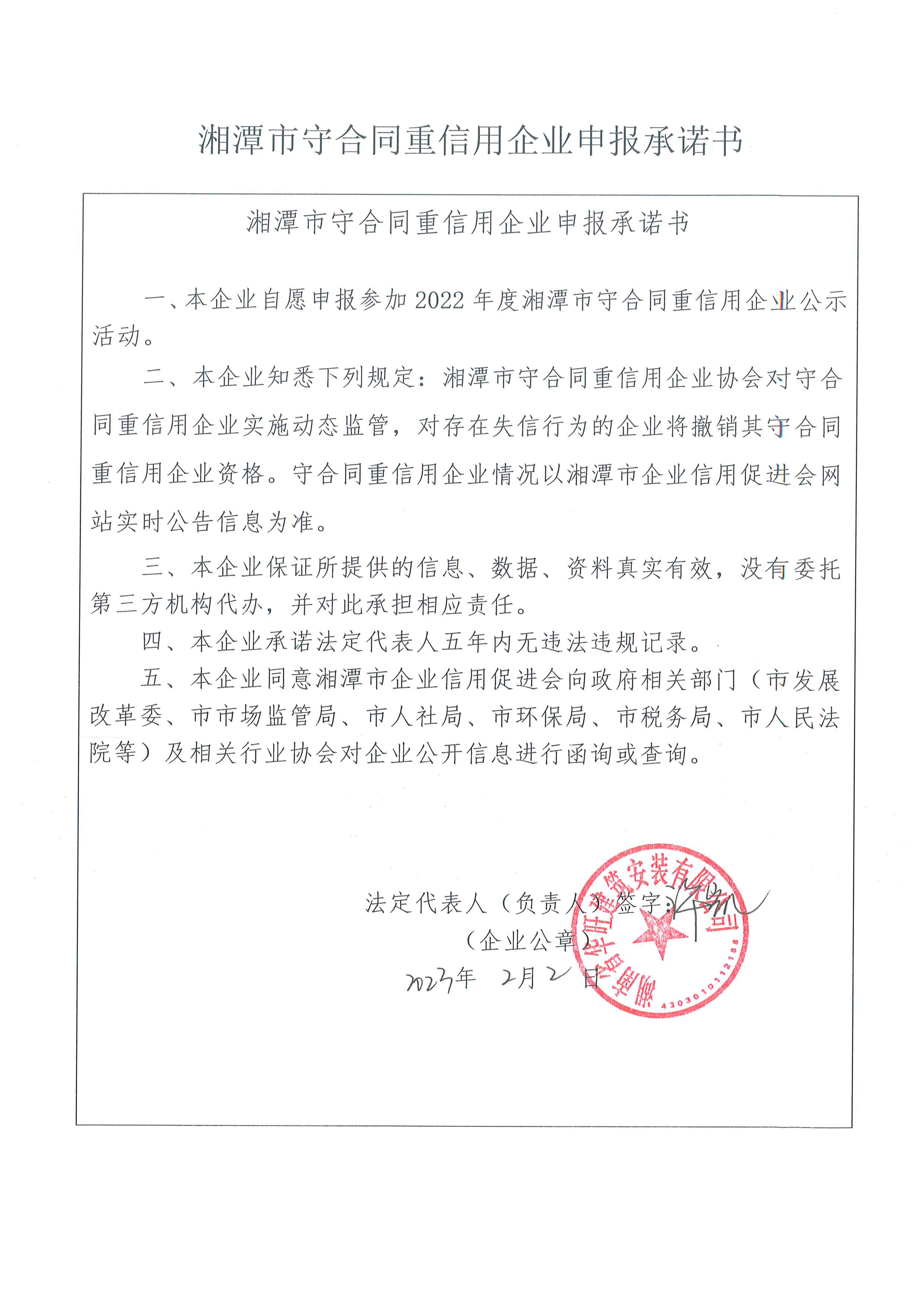 本企業(yè)根據(jù)《湘潭市守合同重信用企業(yè)申報規(guī)定》等編制 2022 年度企業(yè)信用報告書,并保證本報告書內容真實、準確、完整。