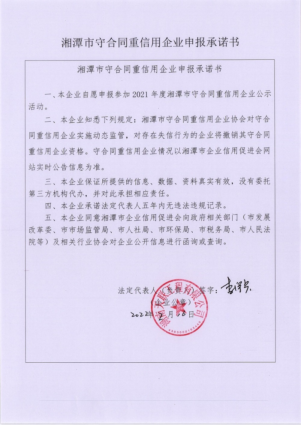 本企業(yè)根據(jù)《湘潭市守合同重信用企業(yè)申報規(guī)定》等編制 2021 年度企業(yè)信用報告書,并保證本報告書內(nèi)容真實、準確、完整。