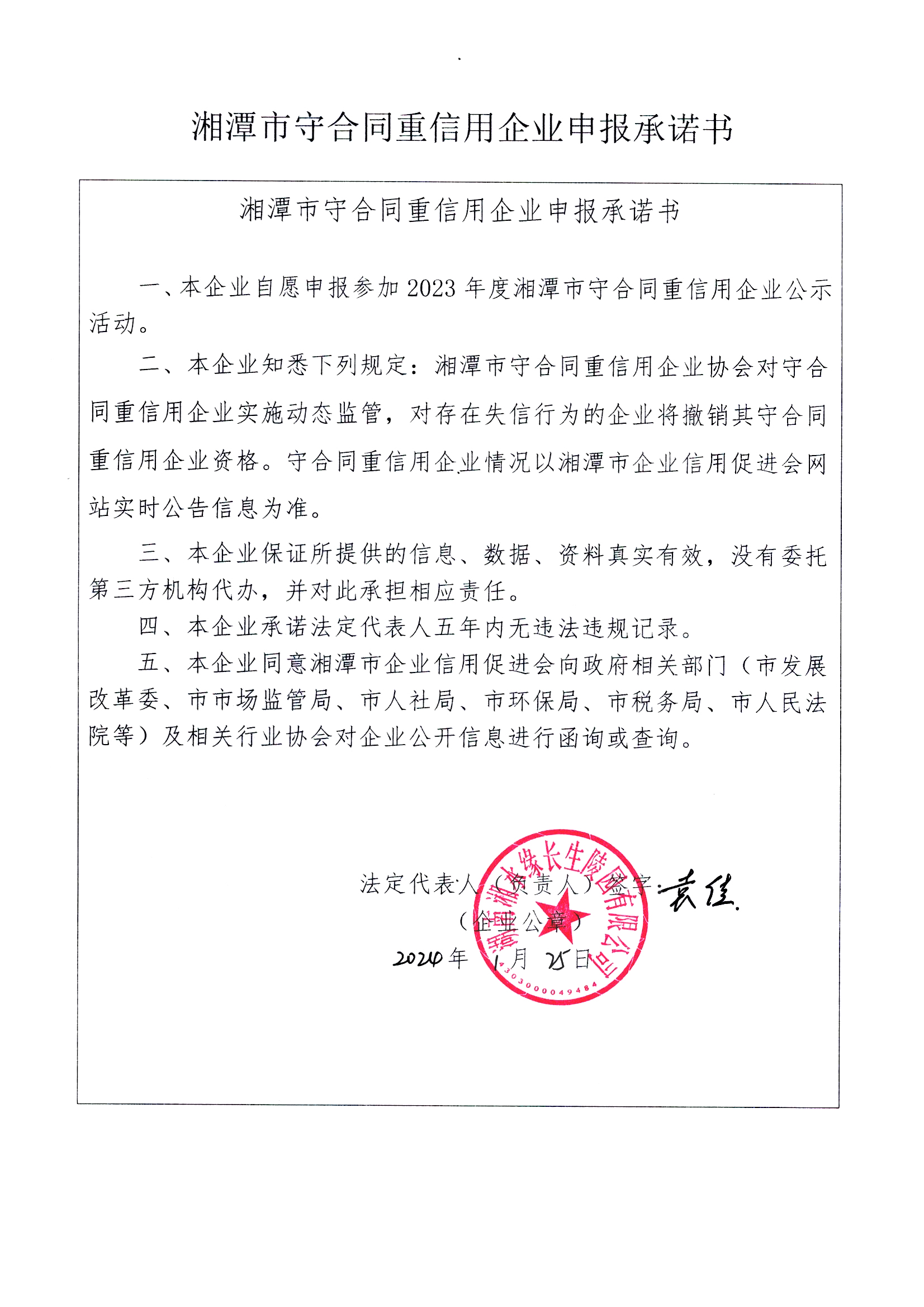 本企業(yè)根據(jù)《湘潭市守合同重信用企業(yè)申報規(guī)定》等編制 2023 年度企業(yè)信用報告書,并保證本報告書內(nèi)容真實、準(zhǔn)確、完整。