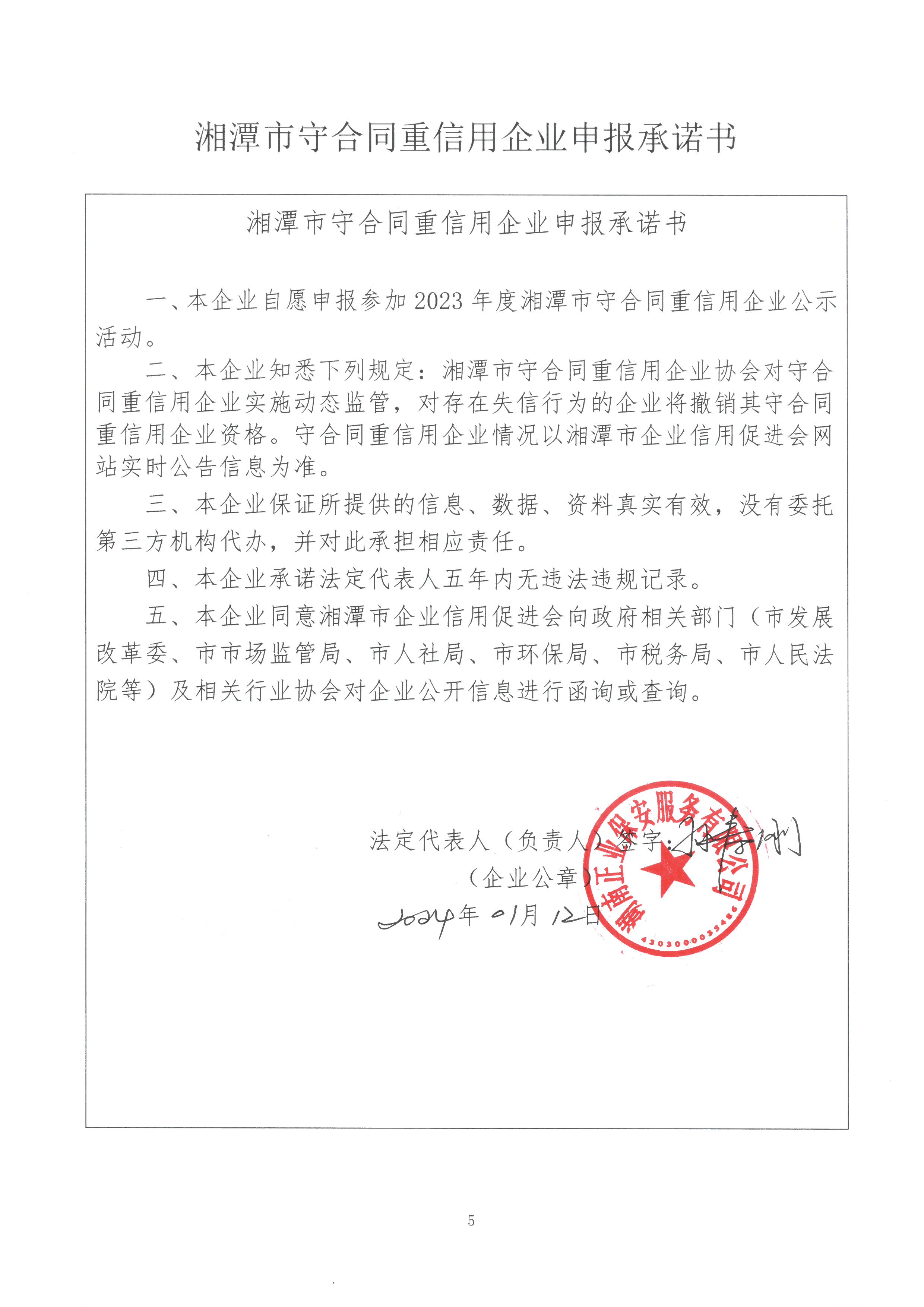 本企業(yè)根據(jù)《湘潭市守合同重信用企業(yè)申報規(guī)定》等編制 2023 年度企業(yè)信用報告書,并保證本報告書內(nèi)容真實、準確、完整。