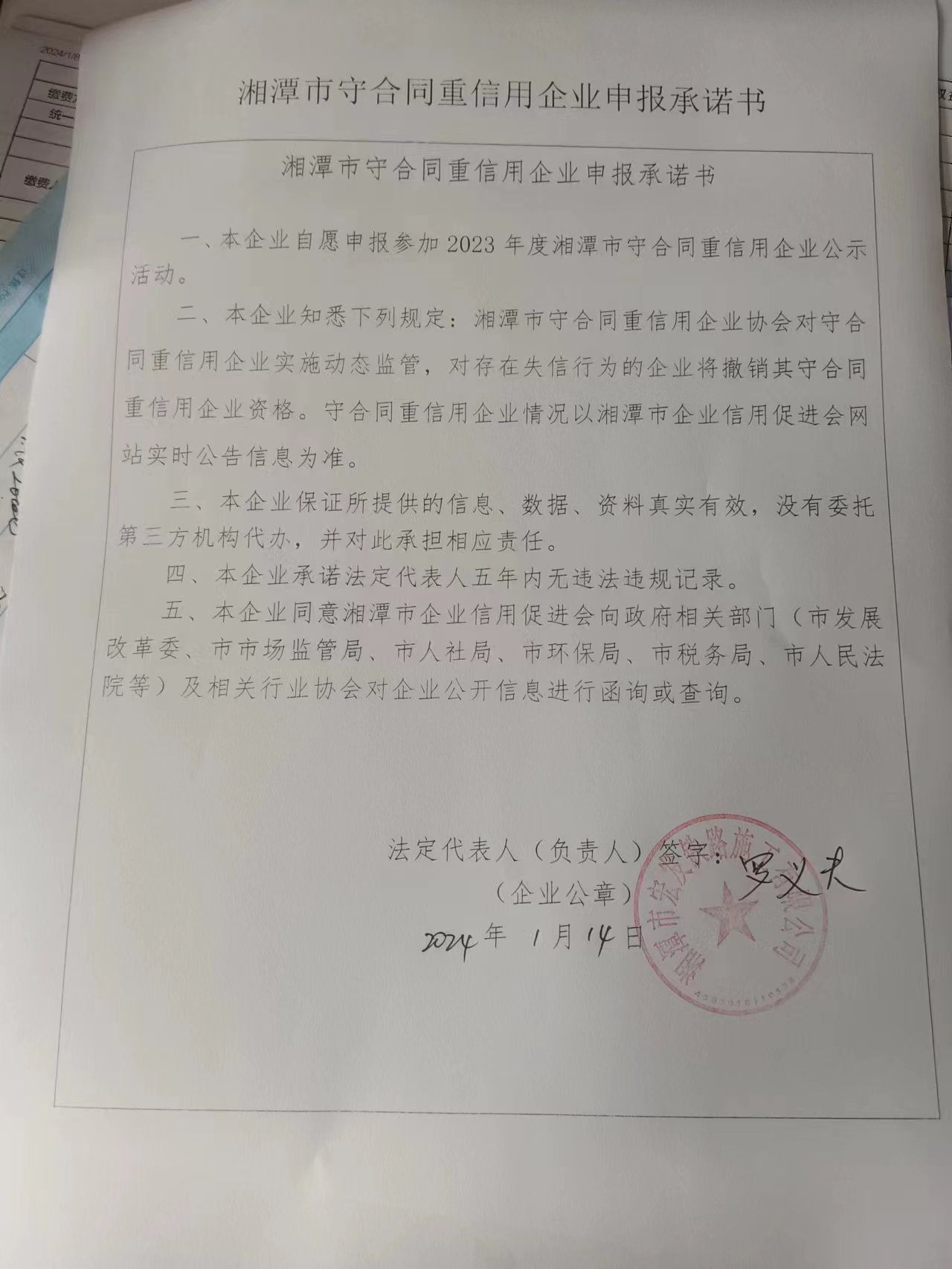 本企業(yè)根據《湘潭市守合同重信用企業(yè)申報規(guī)定》等編制 2023 年度企業(yè)信用報告書,并保證本報告書內容真實、準確、完整。